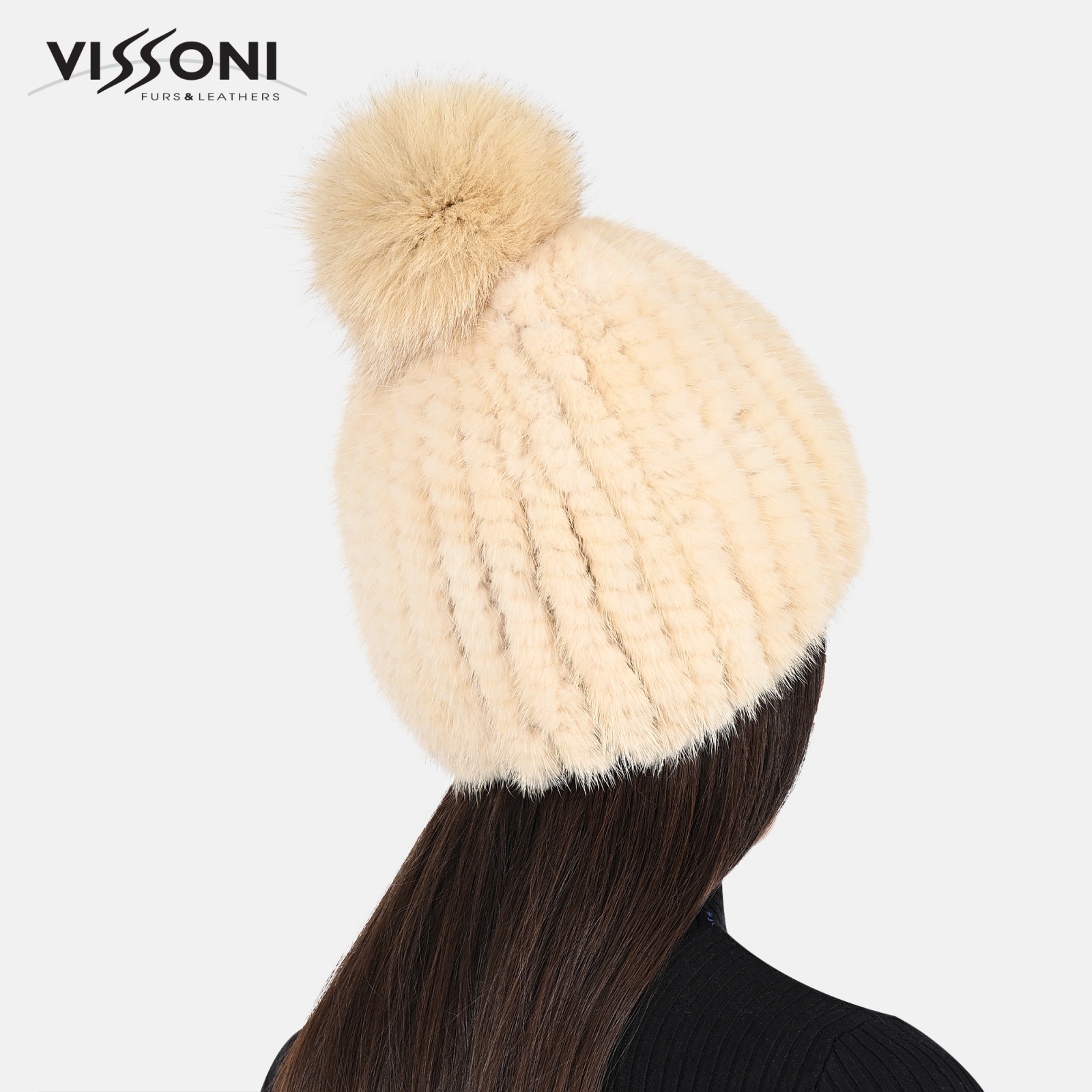 Дамска плетена шапка от естествен косъм на норка с помпон от лисица - Бежава