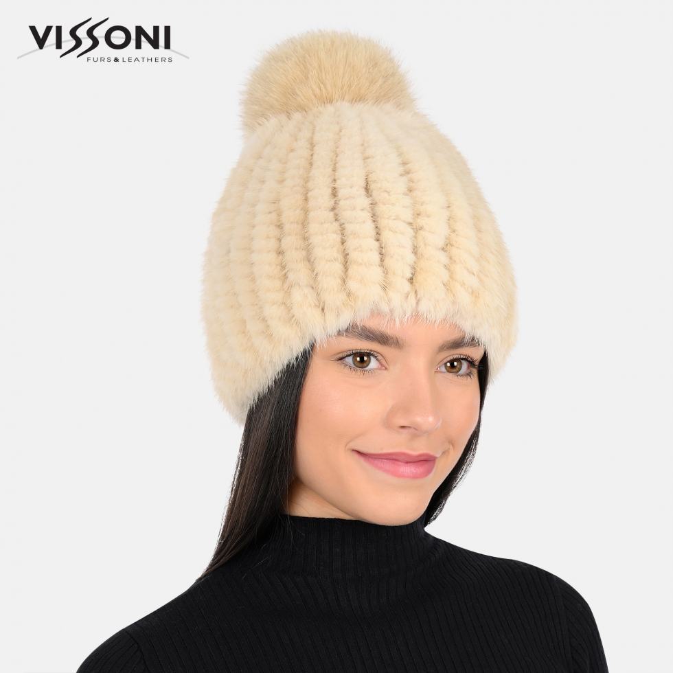 • Дамска шапка от естествен косъм на норка с помпон от естествен косъм на лисица.