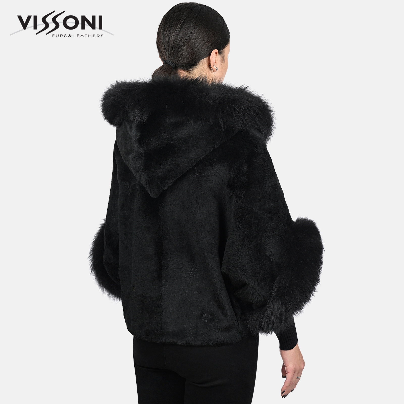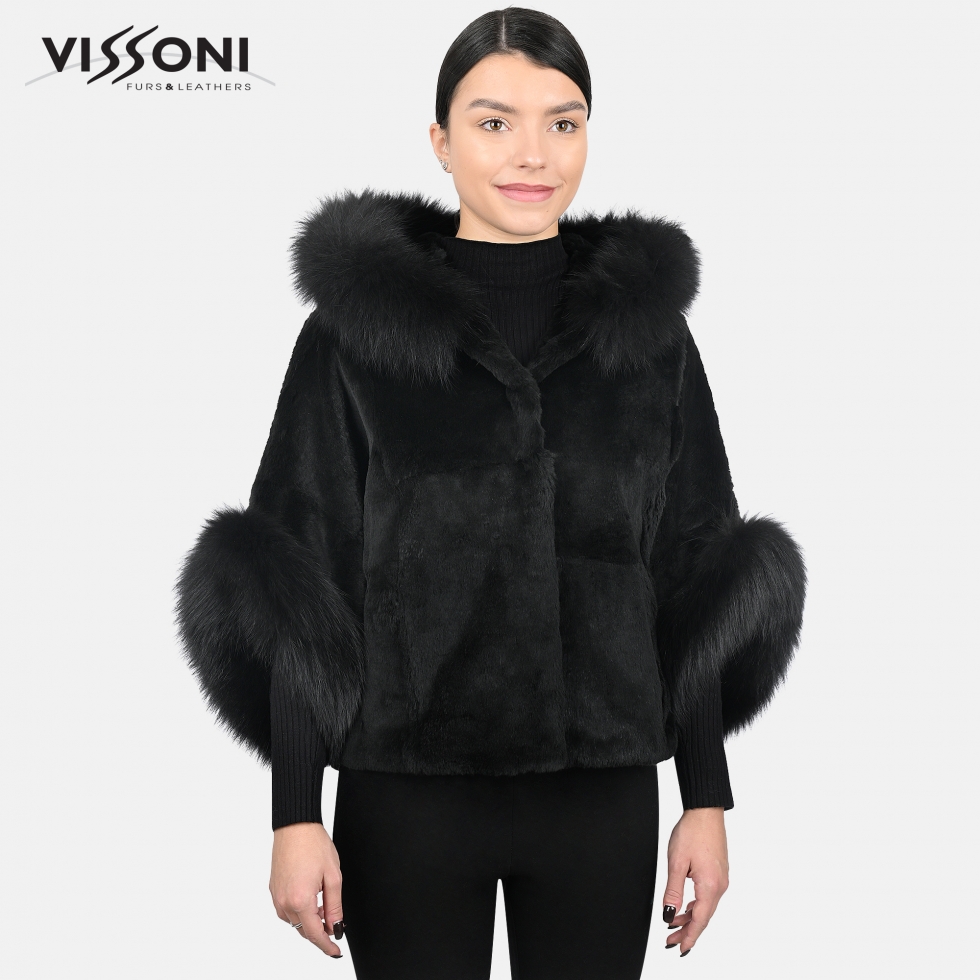 Това луксозно палто е изработено от висококачествена естествена заешка кожа, която осигурява невероятна мекота и топлина. Маншетите и качулката, украсени с пухкав лисичи косъм, добавят изтънченост и уникален завършек към модела. Регулируемата кожена връзка в ханша позволява по-спортна и ежедневна визия, съобразена с Вашия стил.