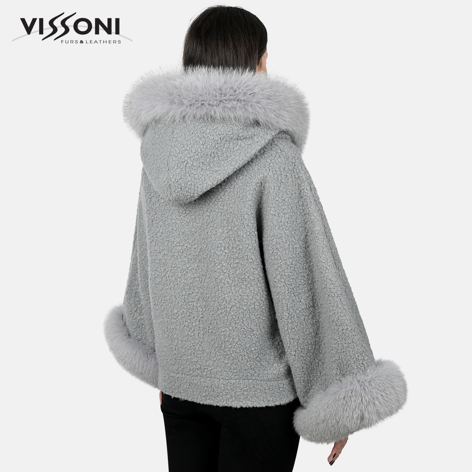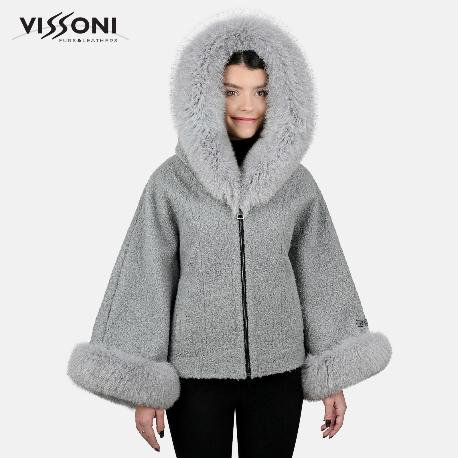 Дамска елегантна пелерина от Алпака с акценти от лисица - Сив