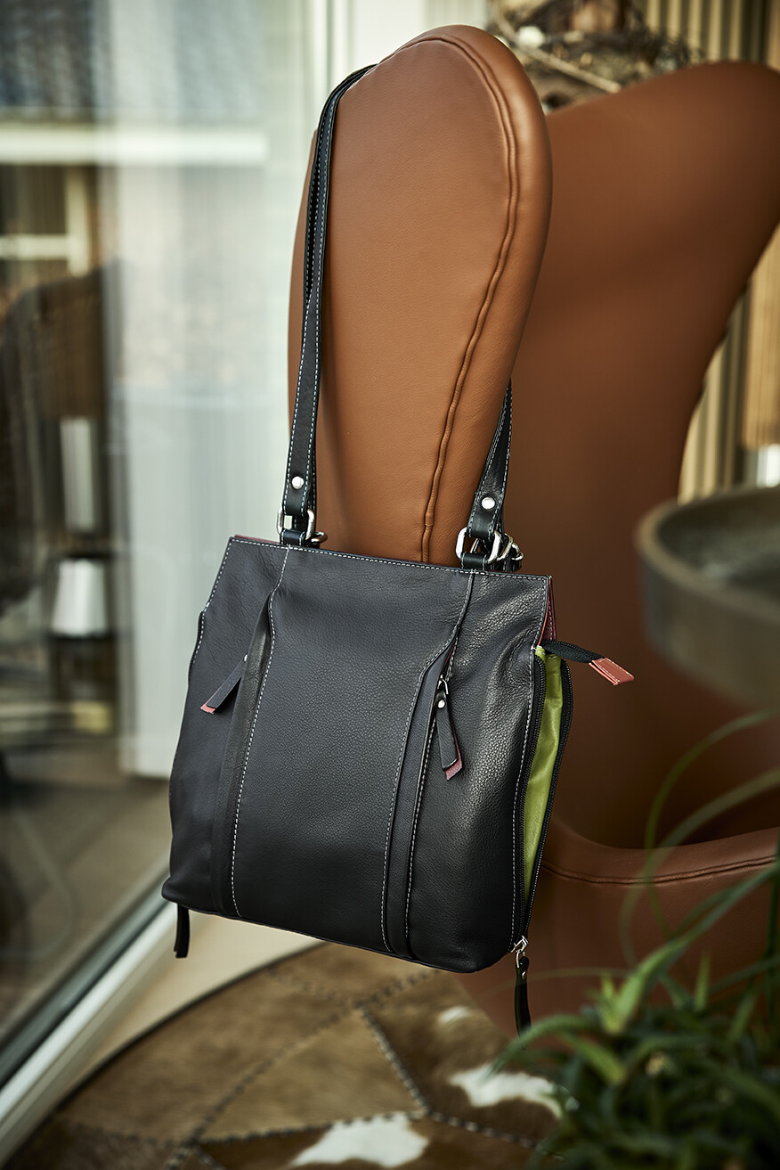 Възможност за разширяване на чантата от двете страни, като телешката кожа е с цветен детайл