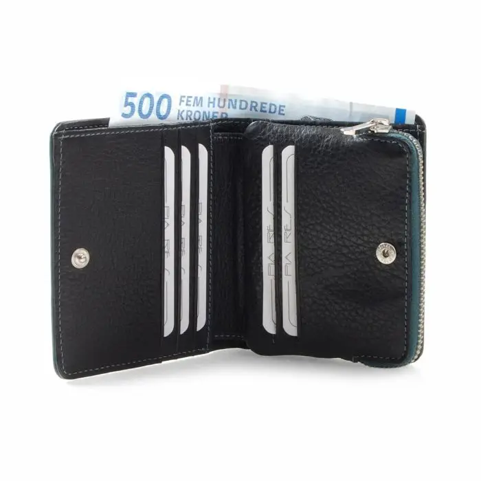 • Отделение за монети в средата на портфейла, което се отваря с цип