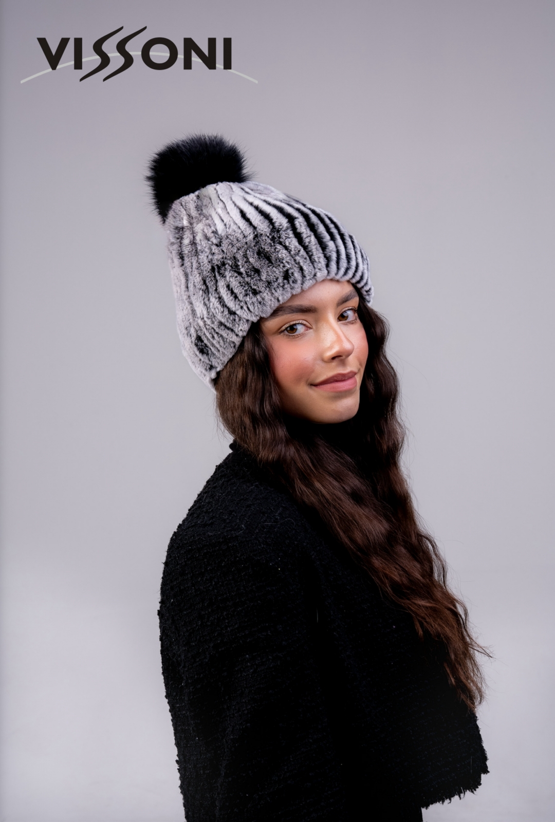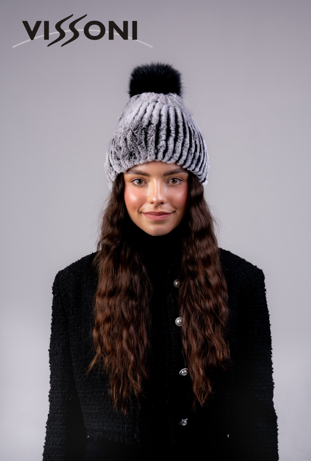 Дамска кафява шапка от естествен косъм на Rex Chinchilla с помпон от естествен косъм на лисица.