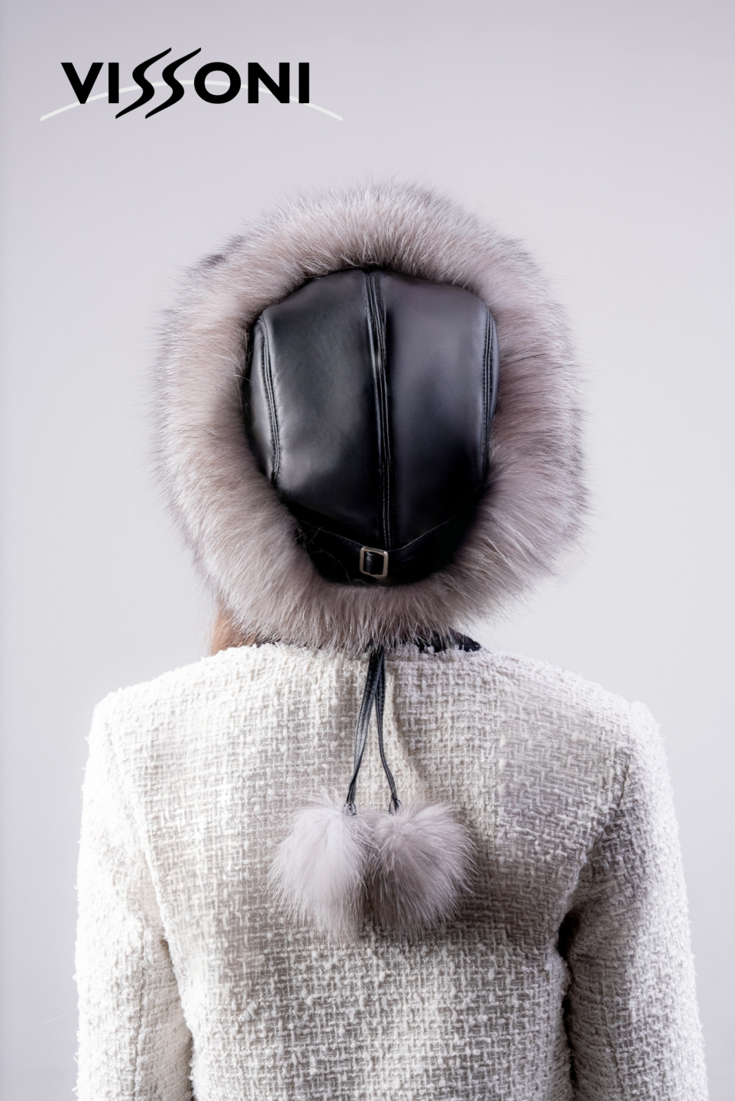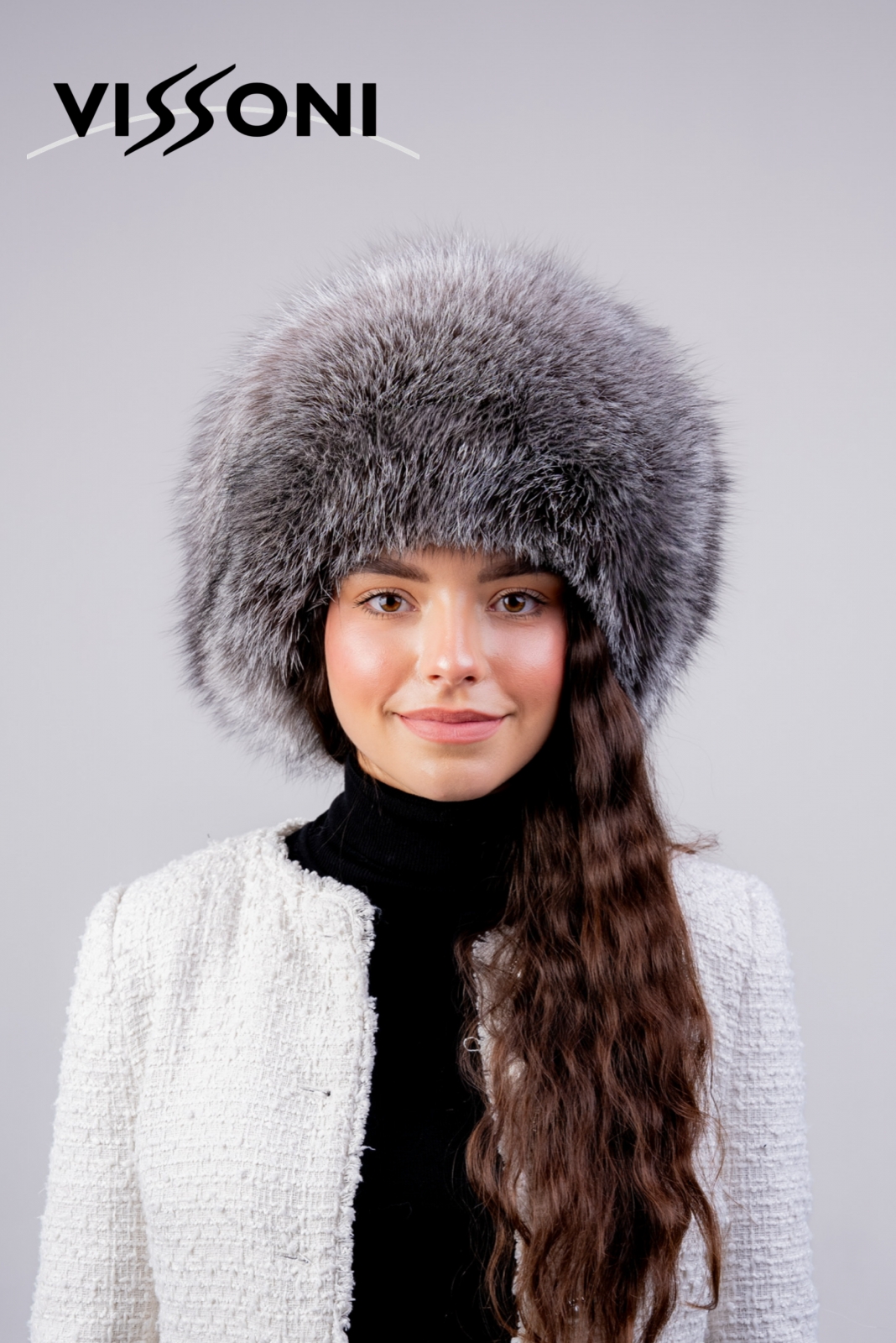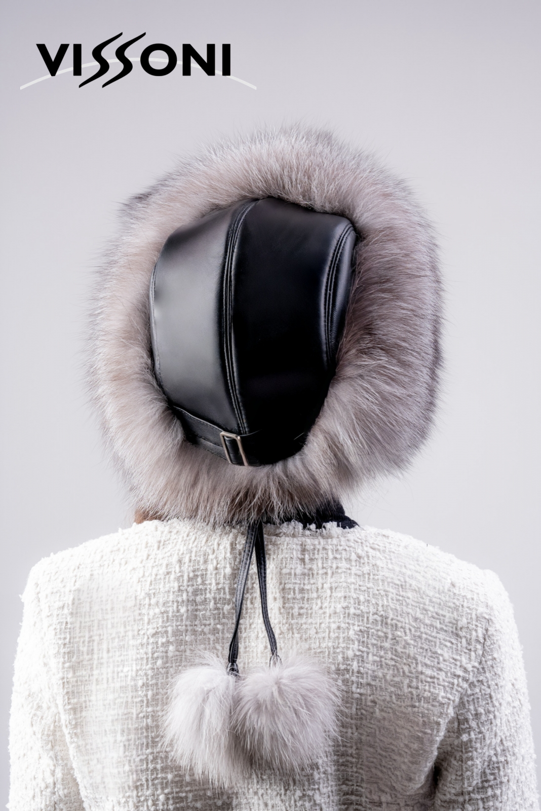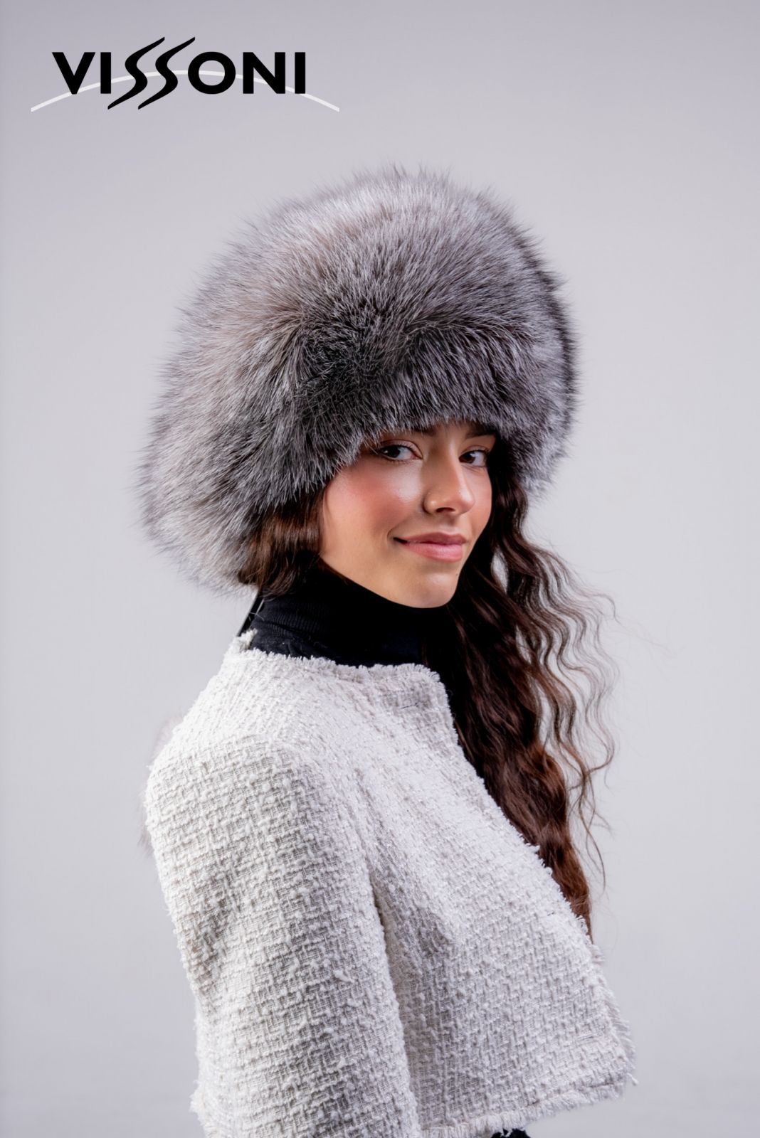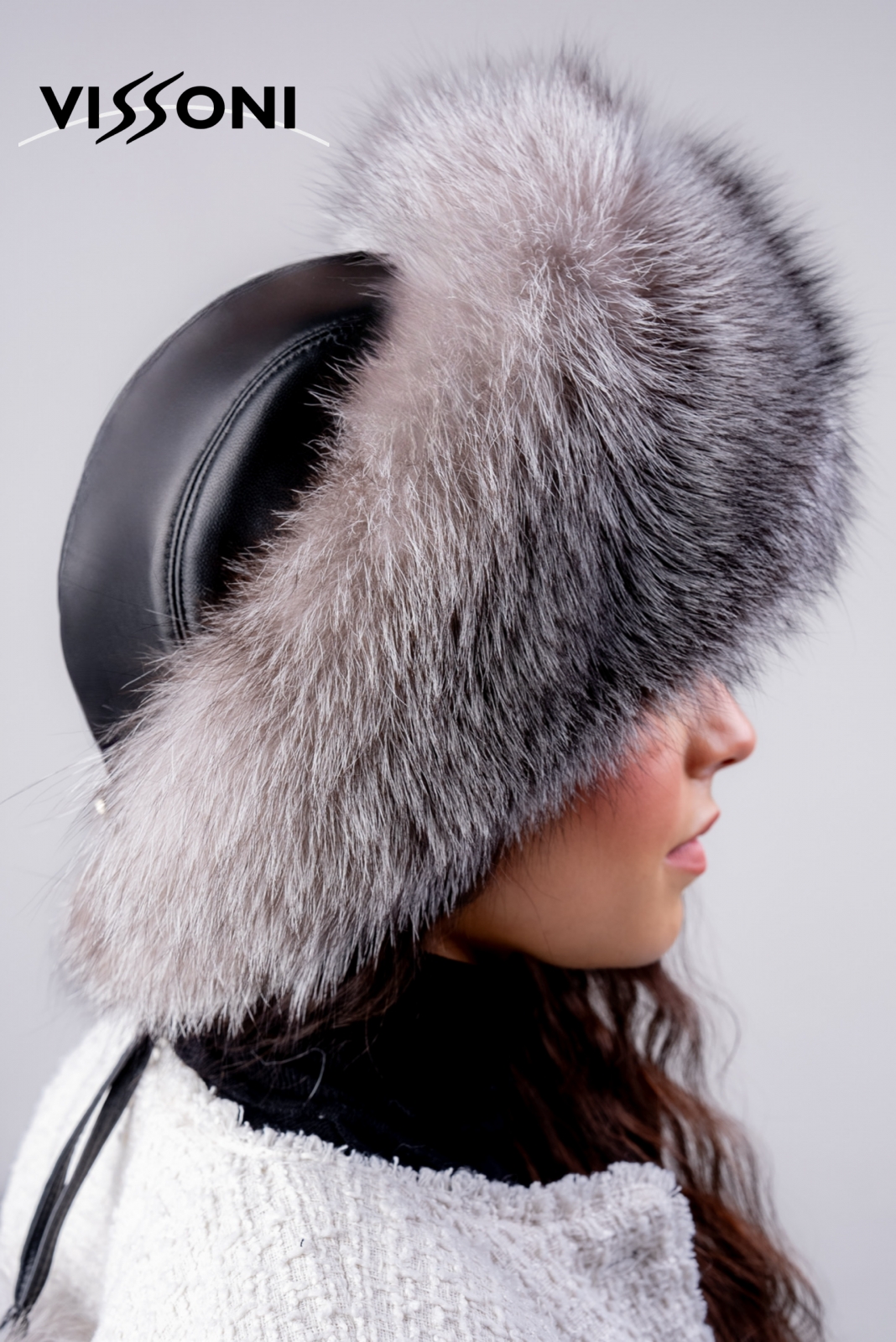 Елегантна дамска шапка от естествена агнешка напа (лицева кожа) в комбинация с борд от пищен косъм на сребърна лисица, цели кожи.