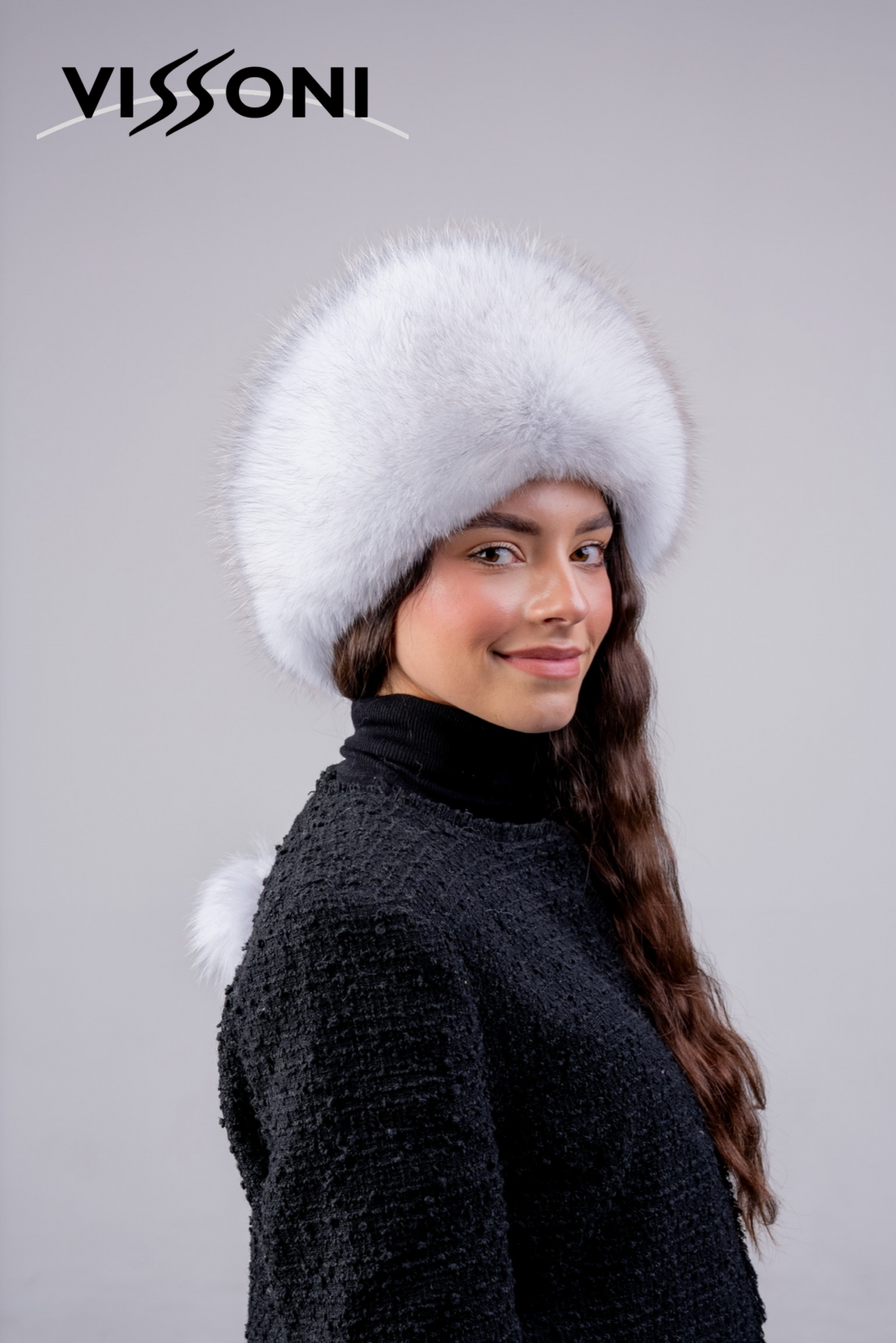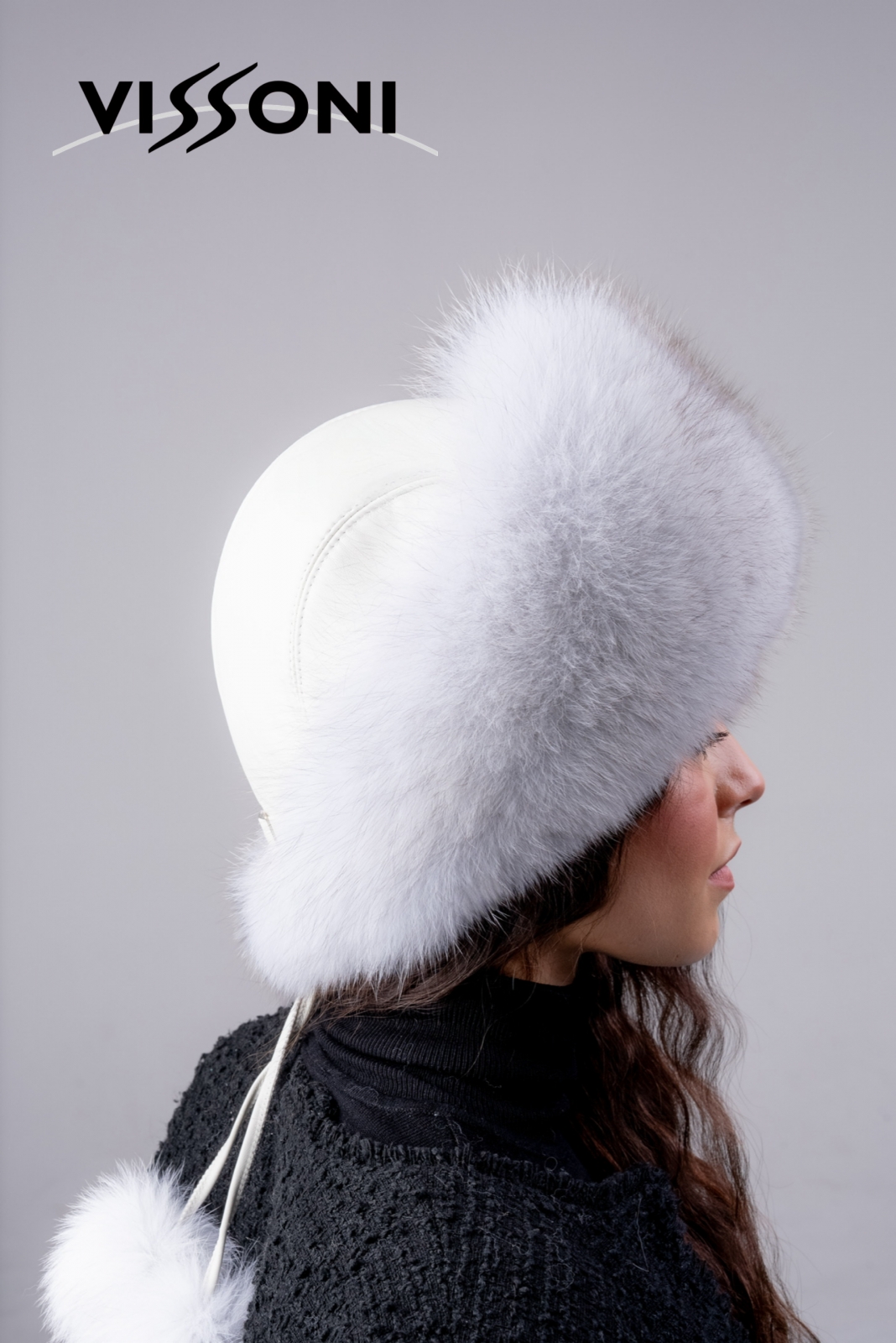• Елегантна дамска шапка от естествена агнешка напа (лицева кожа) в комбинация с борд от пищен косъм на лисица, цели кожи.