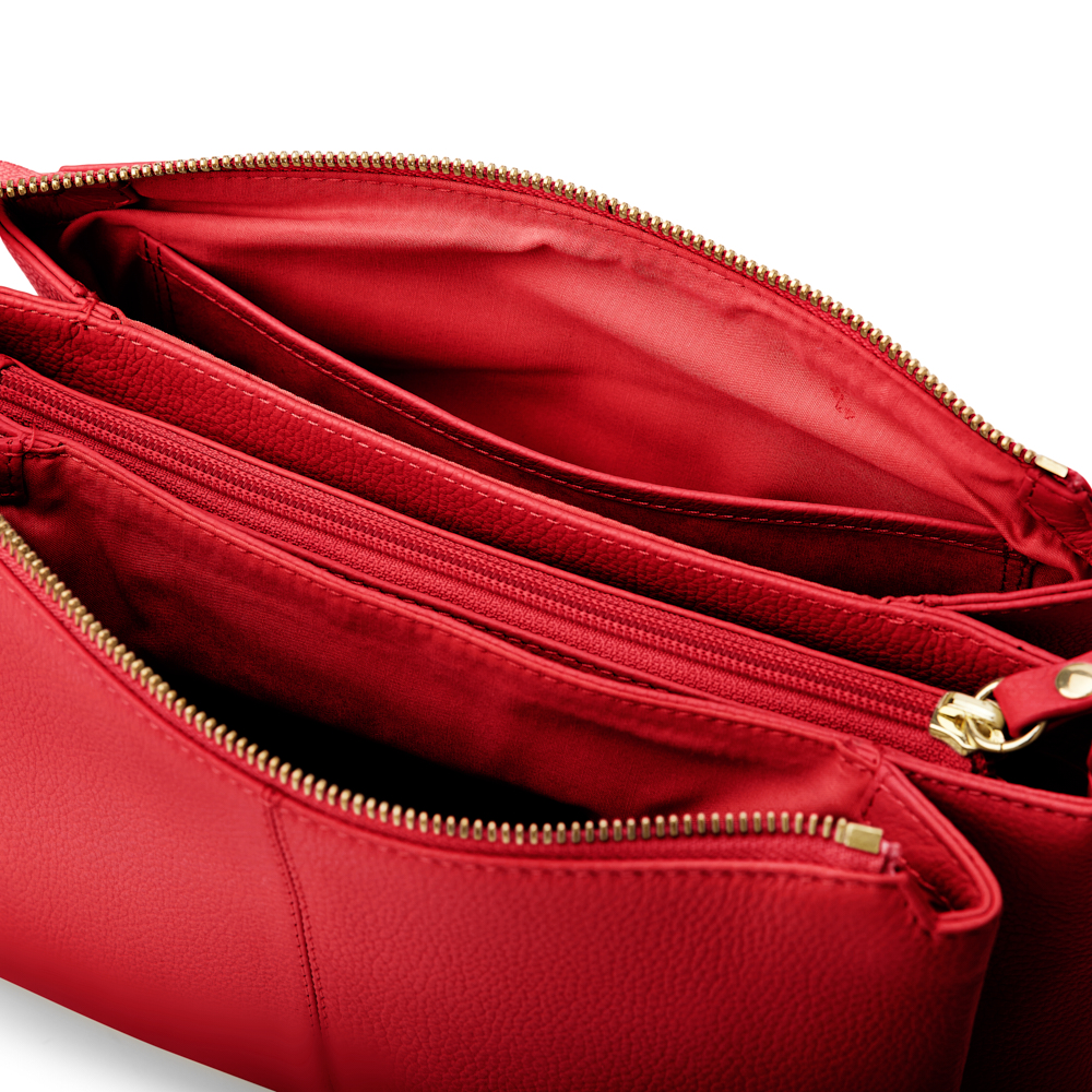 - Отвътре чантата е разделена на три основни отделения, като средното отделение се отваря с цип
