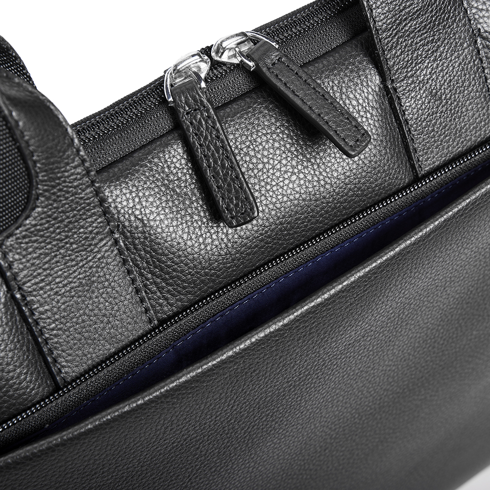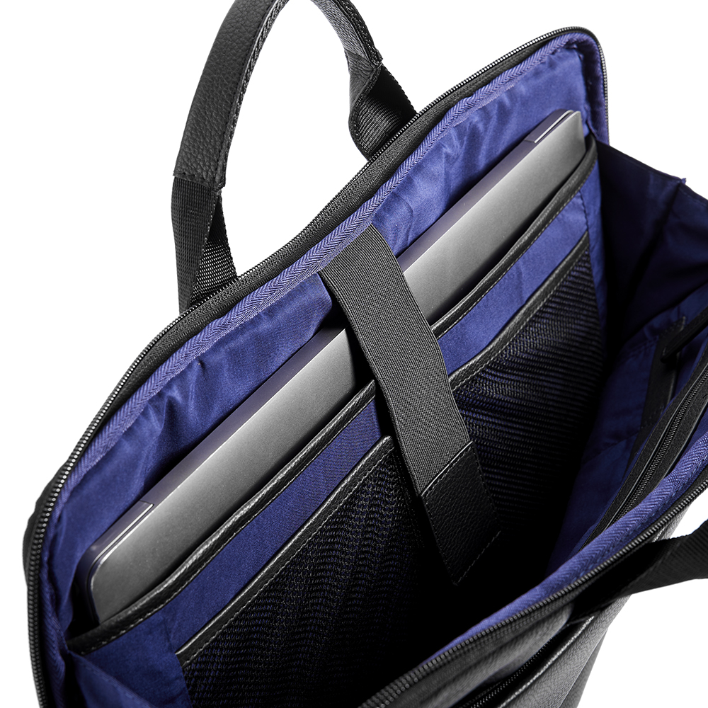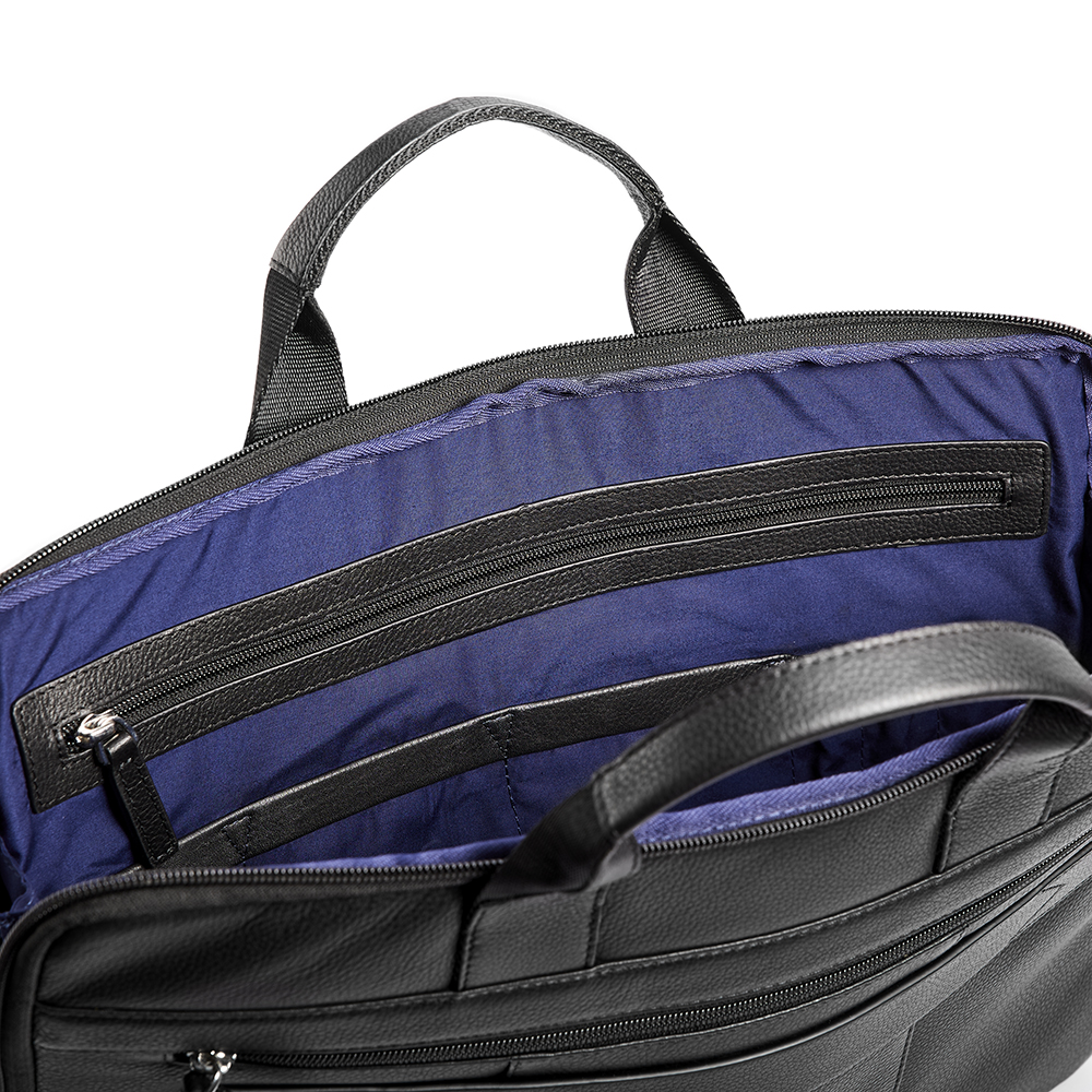 - The bag has one large zippered compartment, divided by a lined protective pocket for your PC.