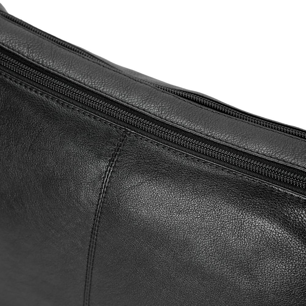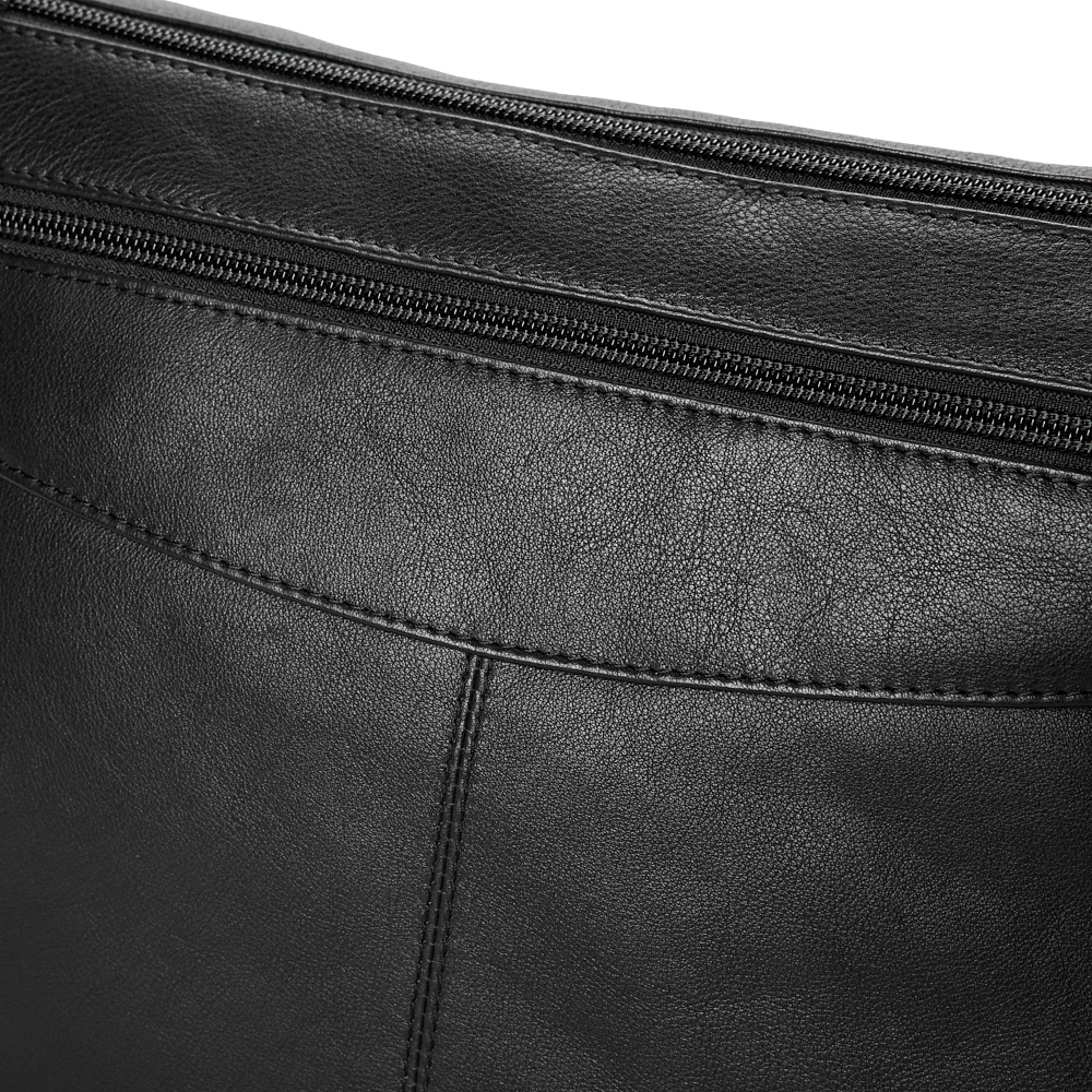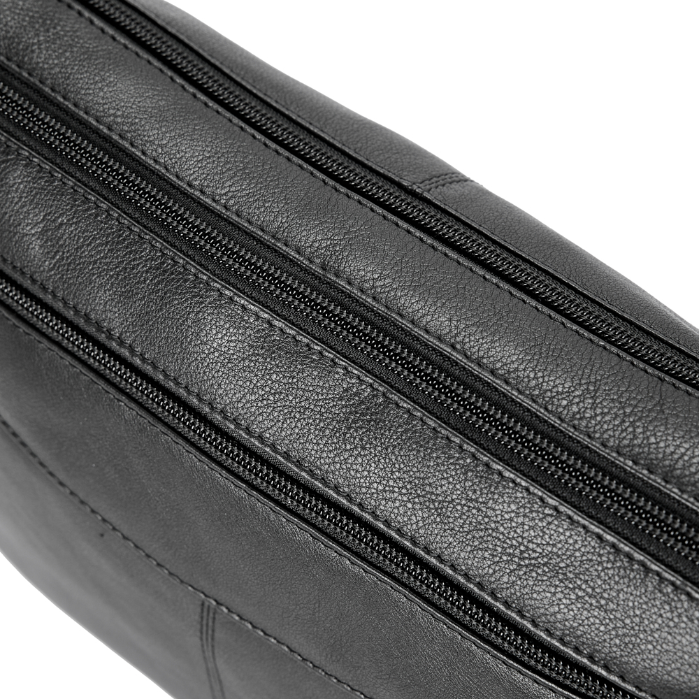 - The bag opens with a zipper - to two equal sized compartments.